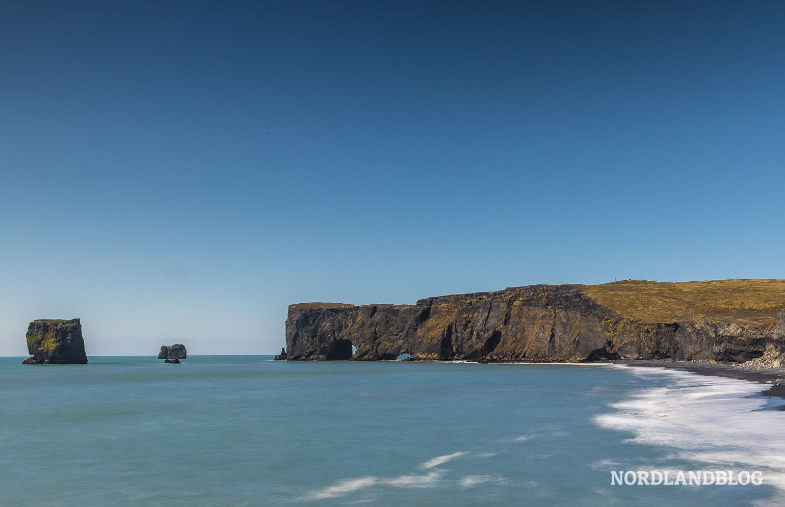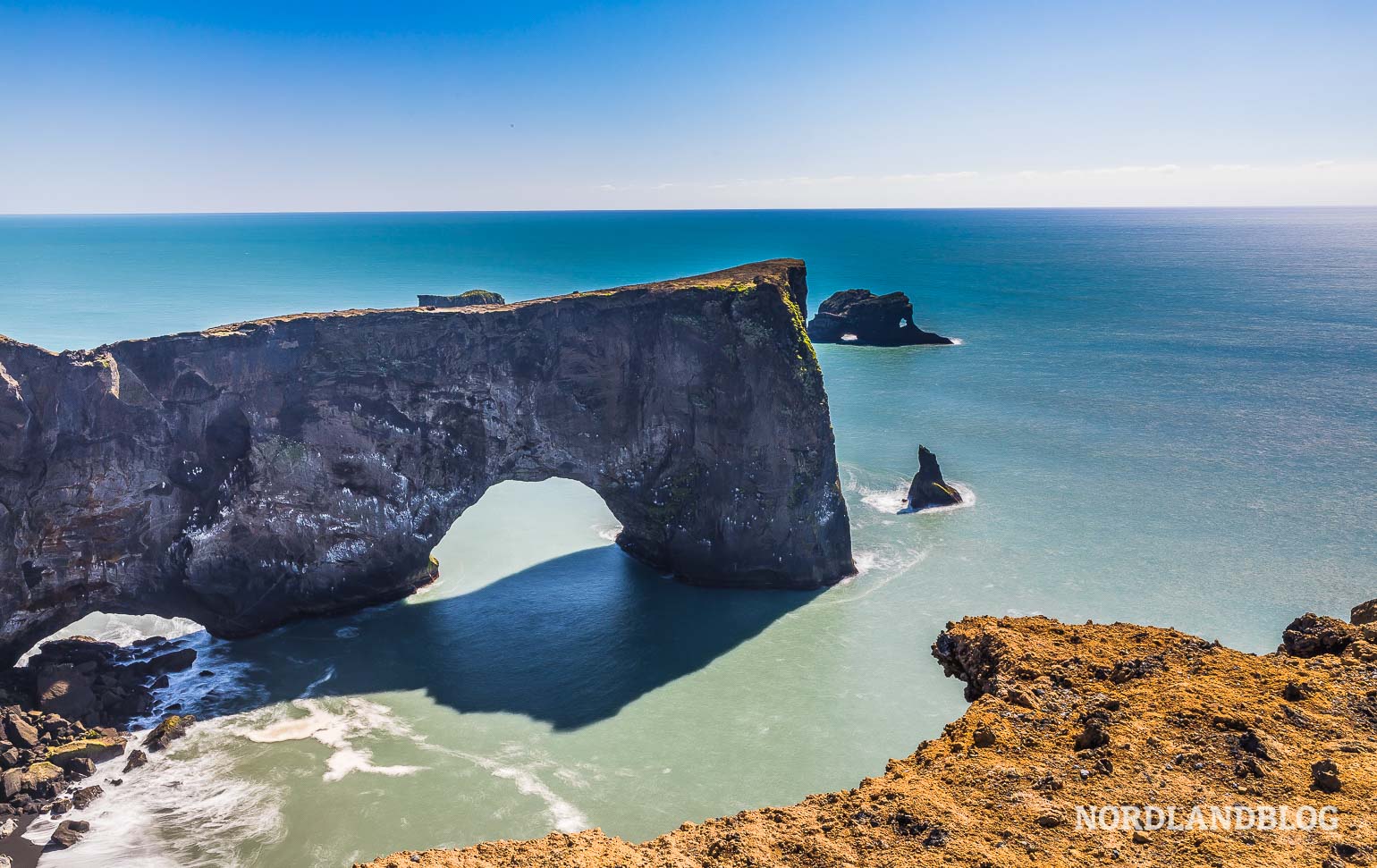Doch zunächst nutzen wir das augenblicklich perfekte sonnige Wetter und fahren noch ein kleines Stück weiter zur nächsten Landzunge mit dem grandiosen Kap und Felsentor Dyrhólaey sowie dem ebenfalls bekannten schwarzen Strand von Kirkjufjara. Diese alle wirklich sehenswerten Attraktionen kann man mit einer kleinen Wanderung verbinden, wobei es egal ist, ob man den Parkplatz unterhalb vom Leuchtturm Dyrhólaey oder den besser ausgebauten Parkplatz oberhalb vom Strand nutzt, wo es inzwischen sogar Besuchertoiletten gibt. Wir nutzen den letztgenannten Platz, essen noch eine Kleinigkeit im Auto und machen uns dann auf den Weg über die Klippen dieser unglaublichen Steilküste. Leider ist der Zugang auf das Felsentor nicht mehr möglich, da durch die Erosion dieser Bereich zwischenzeitlich einsturzgefährdet und damit gesperrt ist.