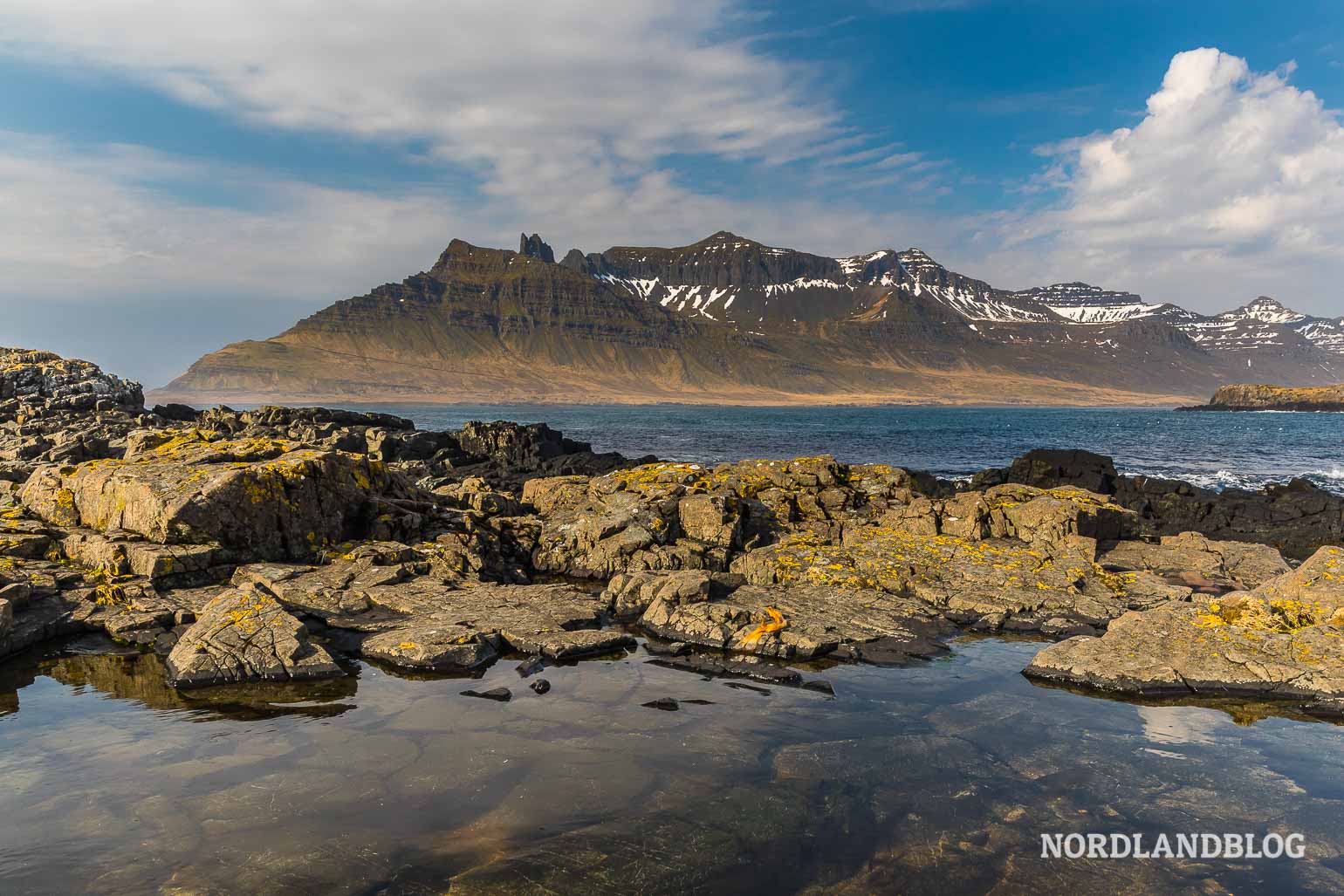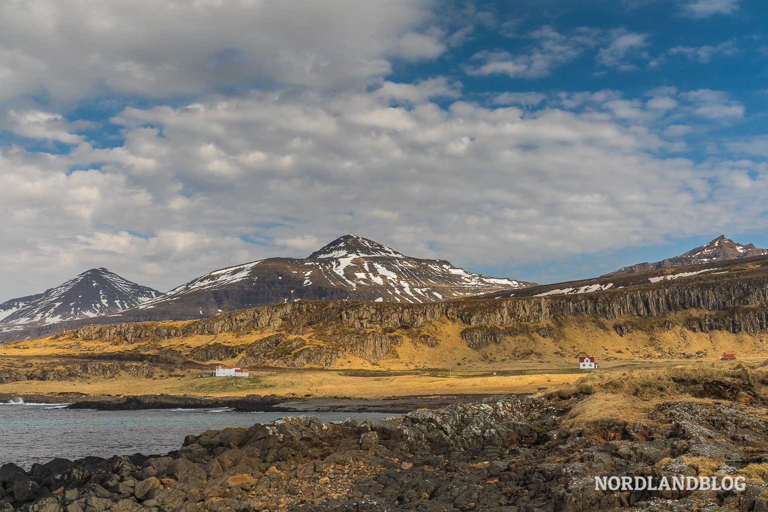 Nach dieser ungeplanten “Mini-Wanderung” passieren wir die Landspitze von Streitishvarf bis nach Berunes – einer alten Siedlungsstätte und heute einem Bauernhof mit Übernachtungsmöglichkeiten und einem kleinen Campingplatz. Hier öffnet sich auch der Blick auf den wirklich imposanten Fjord Berufjörður, der vom riesigen Bergmassiv des Bulandstindur geprägt wird. Bekannt ist die Region für die unwirklich türkisfarbigen Felsen am schwarzen Sandstrand, den Blabjörg (Blauberge), die durch vulkanisch-geologische Prozesse entstanden sind.