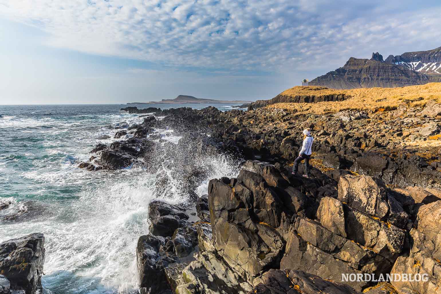 Das Wetter ist tatsächlich perfekt, wir fahren entspannt auf der Ringstraße 1 in südlicher Richtung und genießen die Aussichten, die sich hinter jeder Kurve aufs Neue bieten. Nur eine knappe halbe Stunde später nähern wir uns der Landzunge von Landatangi. Die Küste ist hier bekannt für bizarre Felsformationen, an denen sich die mächtigen Wellen des Meeres auf besondere Weise brechen. Eine Stelle wird daher auch “Saxa Meeres Geysir” genannt, da die Gischt dort immer wieder einige Meter hoch spritzt. Wir parken direkt neben der Straße und brechen auf zu einer kurzen Wanderung an der Küste entlang. Über die Klippen laufen wir bis zum kleinen Leuchtturm auf der Landzunge und genießen dort in der Sonne die Frühlingsluft, die hier wunderbar nach Salz schmeckt.