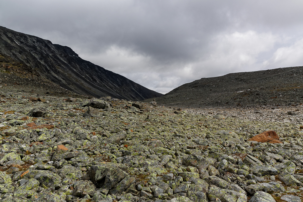 Der Weg beginnt mit schönen Passagen im Veodalen. Teilweise gibt es Brücken, manchmal Bohlen, um die Flussläufe und das teilweise sumpfige Terrain zu durchqueren. Ansonsten springen oder mühen wir uns von Stein zu Stein, damit die Stiefel nicht gleich zu Beginn der Tour unnötig nass werden. In den ersten Stunden gibt es auf diese Weise nur einen Höhenunterschied von ca. 100 Metern, bevor der Weg am Talende deutlich steiler wird und über unzählige Steine und Geröll zum See Vesgluptønnen führt. Auch um den See herum bleibt nur das Klettern über große Steinblöcke bis wir eine Hochebene erreichen.