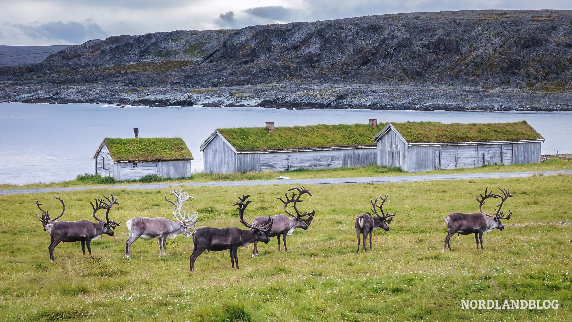 An den Buchten von Sandfjord und Persfjord wird die Straße von feinsandigen Stränden flankiert, auf denen sich im Sommer Rentiere in der Meeresgischt abkühlen oder friedlich in den Dünen äsen. Hoch über den steilen Klippen kreisen Seeadler, Möwen und Küstenseeschwalben. Und irgendwann – ohne große Vorankündigung – prangt in weißen Lettern auf tiefblauem Grund: Hamningberg. Willkommen am Ende der Straße, willkommen am Ende Europas.