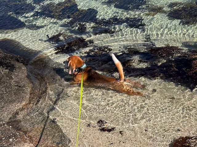 Für mich als Hundebesitzerin ist es selbstverständlich, dass ich Jay in Schafsgebieten und unübersichtlichem Gelände stets an der kurzen Leine führe. Ansonsten nutze ich gern eine lange Flexileine, an der sich Jay auf sicheren Wegen im Radius von acht Metern bewegen kann – perfekt zum Austoben, Schnüffeln und Abkühlen in einem Bach, See oder im Meer.