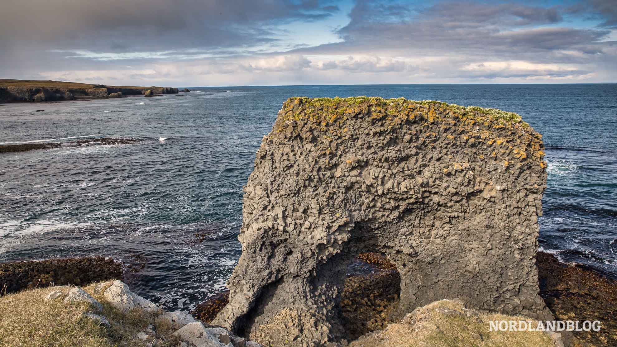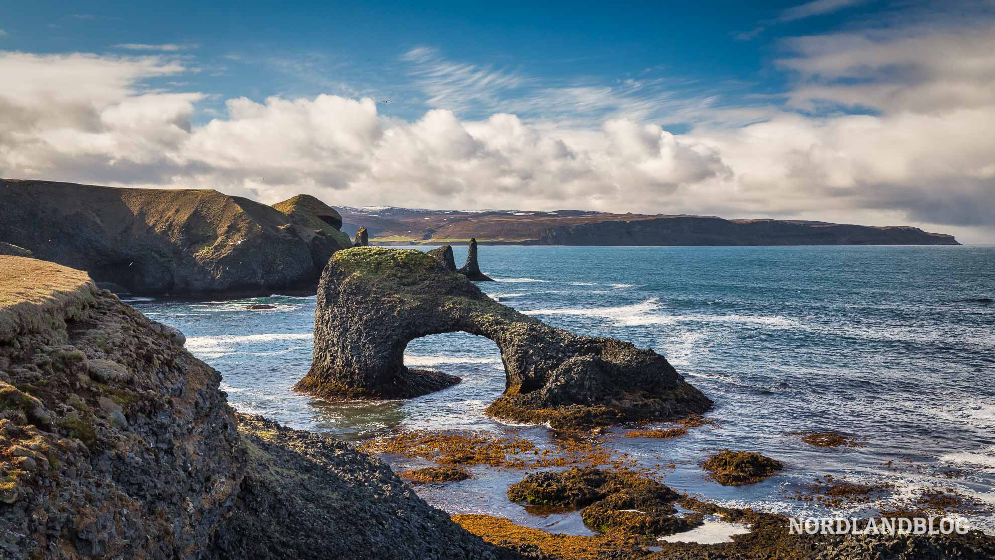 Nachdem wir im letzten Teil unserer Erlebnisberichte vom Felsen Hvitserkur am See Myvatn entlang den Norden Islands erkundet haben, stehen wir nun hier – an den wuchtigen Basaltmonumenten vom Steinkreis Arctic Henge. Ein Einwohner von Raufarhöfn hatte die Vision, diese Attraktion zu errichten. Leider hat er die Fertigstellung seines Traumes nicht mehr erleben können, da er zuvor einem Krebsleiden erlag. Die Steintore auf der Hochebene oberhalb des Dorfes entwickeln sich zwischenzeitlich zu einem beliebten Fotomotiv – gerade in der Zeit der Mitternachtssonne oder wenn in kalten Nächten die Nordlichter über dem Nordosten von Island mystisch darüber tanzen.