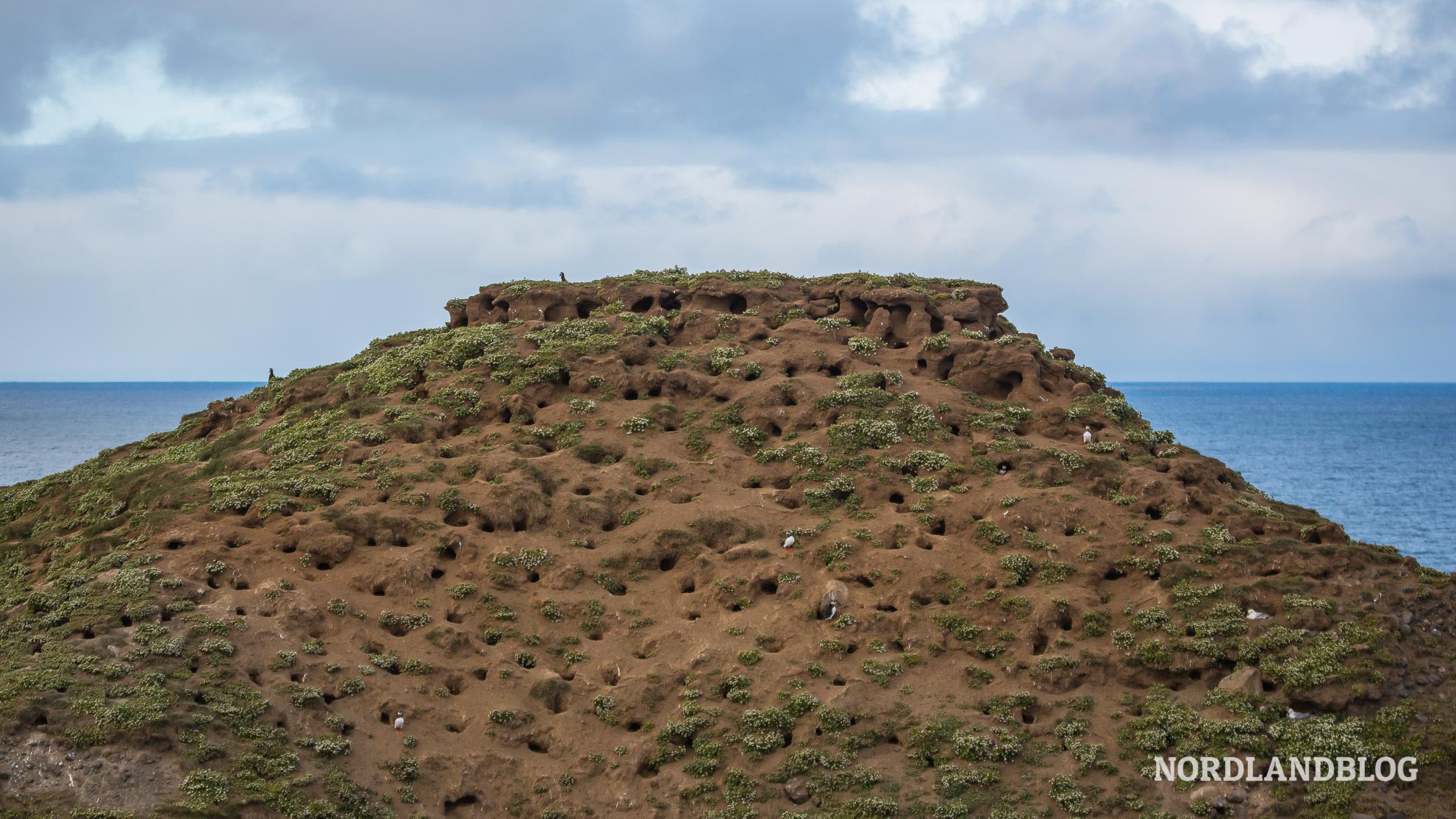 Kurz vor dem Kap entdecken wir einen Felsen, der von den Papageitauchern wie ein Schweizer Käse durchlöchert wurde. Aus dieser Perspektive lässt sich das Treiben in einer Kolonie der possierlichen Seevögel mal auf eine ganz andere Weise beobachten. Während Conny sich kaum von diesem Ort trennen kann, baue ich bereits in der Nähe das Stativ auf. Von hier aus hat man einen perfekten Blick auf das markante Felsentor Raudanes. Nur etwas später haben wir bereits eine schöne Langzeitbelichtung von diesem Motiv im Kasten und können unsere Wanderung auf der kleinen Halbinsel Raudanes fortsetzen.