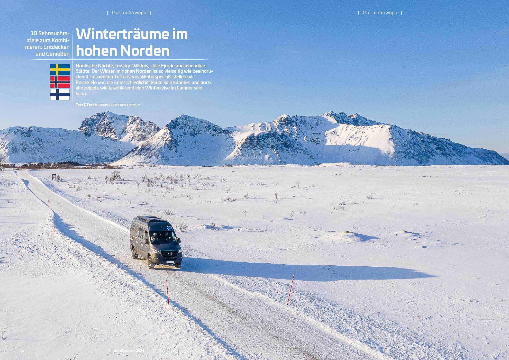 Diese Ausgabe widmet sich ausführlich dem Reisen im hohen Norden zur kältesten Zeit des Jahres. Es geht um vereiste Straßen, Nordlichtnächte, Gasversorgung, Reifentests und echte Erfahrungen im Wintercamping. Mit dabei: ein Interview mit einem Winterreifen-Profi aus Finnland und jede Menge Tipps sowie Sehnsuchtsziele für alle, die mit dem Gedanken spielen, Skandinavien auch einmal im Schnee zu entdecken.
